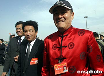 三月十日下午,十届全国人大二次会议举行第四次全体会议听取常委会和两高报告,全国人大代表、著名喜剧明星赵本山身着红色唐装出席大会。中新社记者:张勤