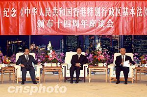 盛华仁说,香港基本法颁布十四年来的历史表明,这部法典的伟大意义在于,它把邓小平关于“一国两制”的伟大构想,用法律形式完整地体现出来,并在香港成为事实。依照基本法所开创的“一国两制”的生动实践,是世界历史上前所未有的伟大创举。事实证明,香港基本法是香港长期繁荣稳定的根本保证。