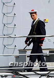 三月十四日,参加中法军事演习的法国士兵在舰艇上巡逻,保障即将到来的演习万无一失。中新社记者:宋吉河