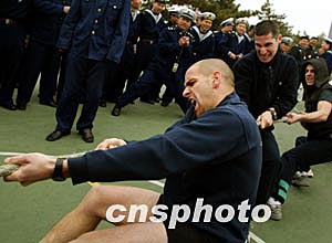 图:参加中法青岛军事演习官兵举行拔河比赛