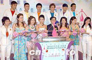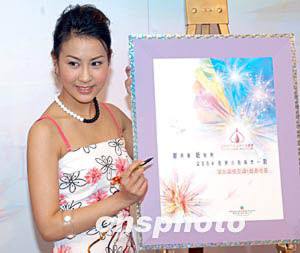 应届港姐曹敏莉、李嘉怡、戚黛黛、杨洛婷、李诗韵(右起)3月15日在香港出席《2004年度香港小姐竞选本地佳丽招募行动》启动仪式,五人展示印上“新美丽新智慧2004香港小姐焕然一新”为口号的竞选报名表格。作者:邓庆乐