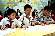 “希望工程——金龙鱼农民工子女助学基金”仪式课三月十六日在广州新蕾五星学校举行。首批2000名农民工子女得到资助。这些孩子将从2004年起得到每学年六百至九百元人民币的助学金,以帮助其完成小学学业。作者:刘卫勇