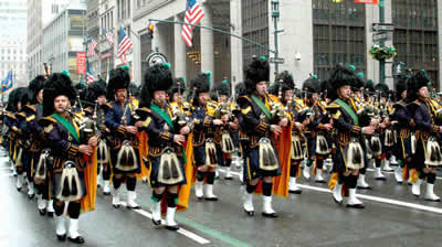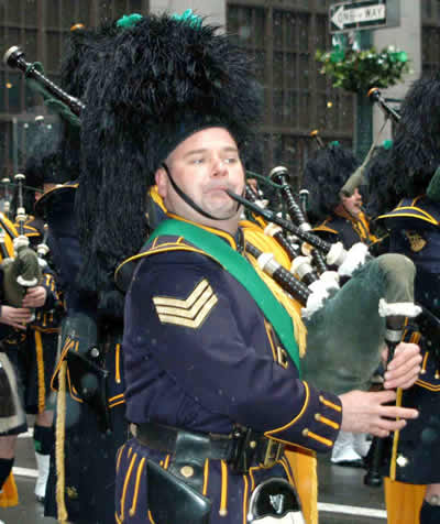 十七日,虽然严寒,却没有影响纽约爱尔兰人庆祝节日的兴致,爱尔兰风笛手仍旧穿着花格短裙沿着曼哈顿五大道缓缓行进。引人注目的还有游行队伍中身着迷彩服的美国战士,这是往年并不多见的一只队伍,美伊战争后,这只队伍成为美国爱尔兰裔人的骄傲。