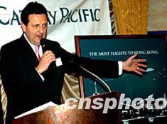 香港国泰航空公司美洲高级副总裁韦栋当地时间三月十八日率领多名高层管理人士从洛杉矶东进纽约,为将于今年七月一日正式启动的香港--纽约直飞航线作热身宣传。作者:赵海燕