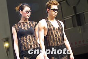 2004高级内衣流行趋势发布会三月二十二日晚在上海世贸商城举行,男女模特展示一款网式情侣内衣。作者:汤彦俊