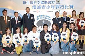 《恒生银行之协助警方扑灭青少年罪行比赛2004》举行揭幕仪式。出席仪式的主礼嘉宾及众歌星艺员于揭幕仪式上合照。作者:邓庆乐