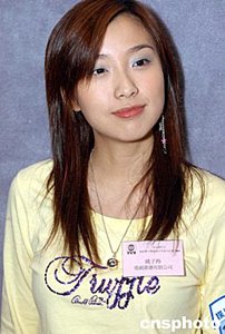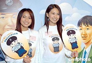 应届港姐冠军曹敏莉、亚军杨洛婷(右起)3月23日在香港出席《恒生银行之协助警方扑灭青少年罪行比赛2004》揭幕仪式。作者:邓庆乐
