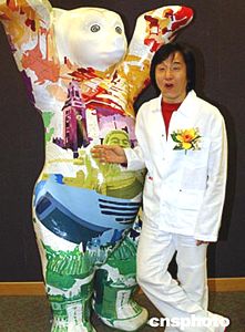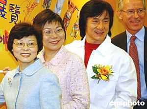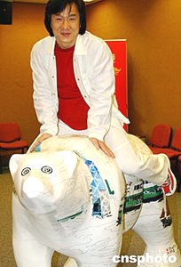 “熊熊爱心连世界”展览三月二十六日在香港举行记者会,该展将于五月至六月在维多利亚公园展出,是次活动旨在宣扬爱心、和平与团结,同时推动公众艺术。图为香港民政事务总署署长陈甘美华、康乐及文化事务署署长王倩仪、明星成龙以及德国驻香港总领事海因裹希·威廉·博伊特在记者会上签名。作者:钱兴强