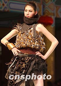台湾青年设计师陈琦珍在三月底北京“汉帛奖”第十二届国际青年设计师时装作品大赛中,以《武魂》主题将T型台演绎为黑暗深渊的男女武士飘荡之灵。 中新社记者:贾国荣