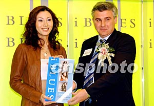 香港明星李嘉欣3月30日在太古广场出席“iBlues 2004春夏时装汇演”, 获得大会颁发“iBlues Cool & Chic”大奖。图为意大利商务专员Carlo Angelo Bocchi向李嘉欣(左)颁奖。作者:洪少葵