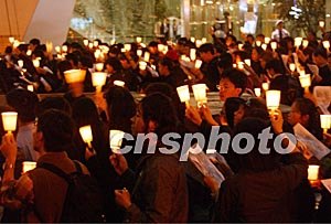 四月一日,是一代歌星张国荣逝世一周年忌日,众多香港及海外歌迷来到文华酒店前,手举烛光杯怀念歌星张国荣。中新社记者:钱兴强