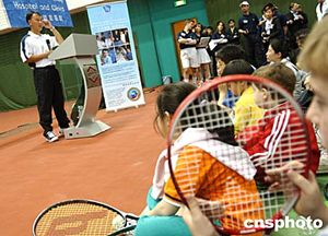 四月三日,美籍华人网球明星张德培应北京和睦家医院之约,来到嘉里健身俱乐部网球中心慈善演讲。此次活动的门票收入全部捐献给美国教育健康基金会,用于帮助中国贫困地区医疗卫生事业和孤残病患儿童。作者:贾国荣