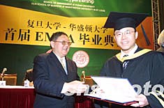 由复旦大学和华盛顿大学合作的复旦——华盛顿首届EMBA学员毕业典礼四月三日晚在上海举行,这是中国国内高校首届EMBA毕业典礼。作者:汤彦俊