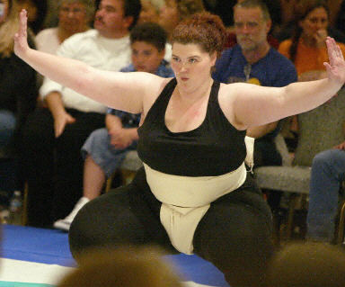 一位女相扑选手在美国洛杉矶举行的相扑表演上亮相。