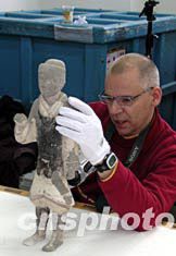中国秦兵马俑一百零二件文物,将在西班牙政府和联合国教科文组织举办的巴塞罗那2004环球文化论坛上展出,展览预计五月九日至九月二十六日举行。图为主办方专家在陕西清点文物装相。作者:姚文森