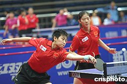 四月十二日,在北京海淀体育馆进行的奥运会乒乓球亚洲区预选赛女子双打第一阶段比赛结束,中国选手郭跃(左)、牛剑锋以不败战绩进入第二阶段。中新社记者:盛佳鹏