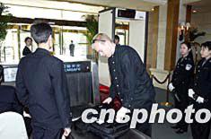 四月十三日上午,美国副总统切尼访华将下榻的北京国际俱乐部饭店开始对进入人员实施安检,以确保安全。中新社记者:毛建军
