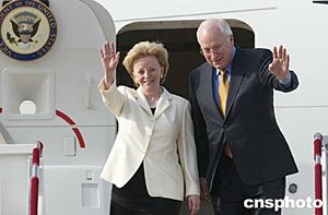 中新网北京4月13日电(记者齐彬)今天下午三时五十分,美国副总统切尼乘坐专机由日本东京飞抵北京,开始其为期三天的工作访问行程,切尼的夫人以及切尼办公室主任等幕僚同机抵达。