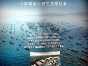 宋涛在郑和舰队帷幕前向记者介绍说,和舰科技是一家外资独资企业,注册资本三点五亿美金,二○○一年十一月进驻苏州工业园区,第一座晶圆制造厂占地一点三平方公里,而苏州给和舰科技留下了一百十公顷土地。