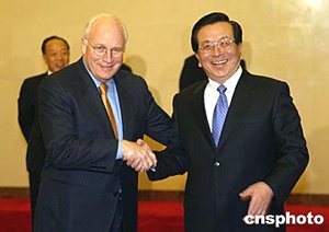 切尼对曾庆红的欢迎表示感谢。他说,非常高兴能够再一次回到中国,重叙旧情。我们也认为这次访问很重要,布什总统对他和胡锦涛主席发展的各种关系感到非常满意,我们认为,双方可以共同做很多方面的工作。我期待着这次会谈,期待着第一次访问上海,我们有机会讨论很多问题,寻求一些方法,加强两国之间的关系。
