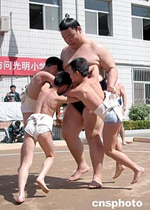 四月十三日,北京光明小学三名小学生挑战来自日本的相扑力士。此次四位相扑力士专程为“二零零四大相扑中国公演”发布会而来,为即将在六月进行的公演做宣传。作者:徐曦弋