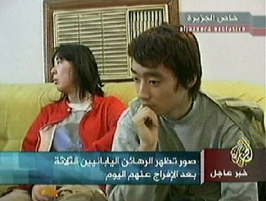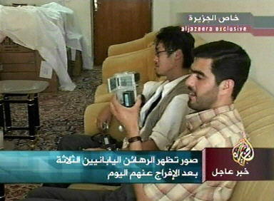 最早的消息来自今晚半岛电视台的报道,日本各大电视台纷纷于第一时间转播其有关消息和图像。消息说,三名日本人被当地的穆斯林长老会所保护,目前身体情况良好。电视镜头显示三名日本人在一个比较宽松的环境中与伊拉克当地人士轻松交谈,应该是脱离了险境。