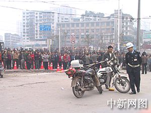 今晨,重庆天原化工厂发生氯气泄漏事件,重庆市政府紧急疏散上万当地群众。图为重庆市政府紧急调集的车辆正在往安全地带输送群众。作者:郭晋嘉  重庆市政府在离事发地两公里的地方拉起的警戒线外围观的群众。作者:郭晋嘉