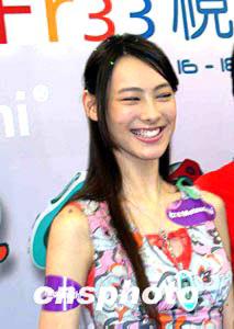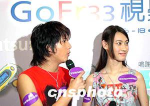 4月17日,香港乐坛Boy’z成员关智斌及新人Isabella(右)担任松日公司MP3代言人。作者:谭达明