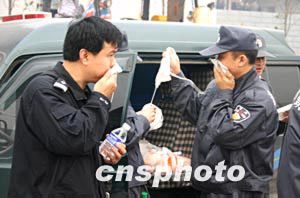 四月十七日,在重庆市天原化工总厂附近待命的警察正在领取口罩。十五日晚,该厂发生氯气泄漏事故,有十五万人撤离。作者:邹辉