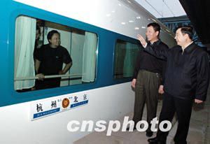 四月十七日晚,铁道部副部长孙永福(右)和北京铁路局负责人在北京火车站为中国铁路第五次提速的首列提速车送行。中国铁路第五次提速十七日晚开始,新开行的十九对直达特快列车中,北京开往杭州的Z9次,于十八点五十三分首发开始运行。中新社记者:王丽南