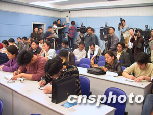 图为情况通报会现场紧张忙碌的记者们。作者:郭晋嘉 范卉