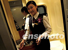 中国第五次提速列车上的卫生间改动最大,加装了整容镜、紧急呼叫按钮等,并首次采用了全新的环保理念,变普通列车的排泄式为集便式,到终点站后统一由保洁公司处理。图为乘务员向旅客介绍新厕所使用。中新社记者:王丽南