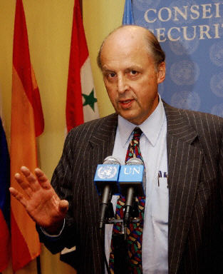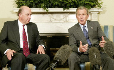 4月19日,美国总统布什(右)在白宫举行仪式,提名美国常驻联合国代表内格罗蓬特(左)在6月30日伊拉克权力交接后出任美国首任驻伊大使。该任命还将通过参议员的审议。内阁罗彭特现年64岁,将在6月30日美伊交权后走马上任。