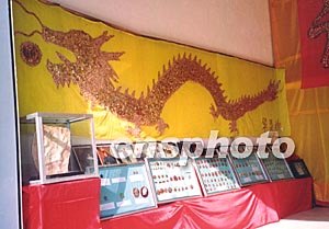 正在广西桂林荔浦县龙怀景区举行的首届世界华商国际投资论坛上,中国著名收藏家陈新记收藏的一万三千多种共二十五万枚毛泽东像章,由其胞兄兰浩铭编排组成龙形龙字等多种图案展出。作者:刘万强