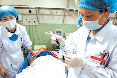 下午3时25分,307医院急诊楼外停放着两辆999急救车,有5名工人已被送进急诊室内。在急诊大厅右侧的一间急救室内,一名50多岁的老人,不停地抽搐着,病床旁放着一个装呕吐物的大桶,两名比较严重的工人则处于昏迷状态,十几名医生正在进行抢救。