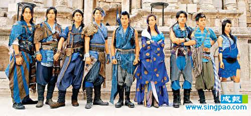 中新网4月22日电 据香港成报报道,九位百事巨星云集安曼古城,各自穿上古装一字排开,气势十足。站在中央的依然是百事老大哥郭富城,天后郑秀文站在他身旁,F4的少侠打扮各有特色,cool味十足,而周杰伦与蔡依林被陈冠希分隔开。九人的造型都是以蓝色为主,周杰伦还扎上长辨,令人甚为新鲜。