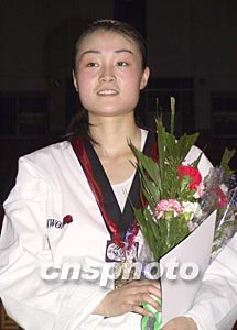 二○○四年全国跆拳道锦标赛暨奥运会资格选拨赛四月二十一日晚在海南海口体育馆举行五十九公斤级决赛,曾获得世界冠军的解放军队选手王朔,获得五十九公斤级冠军,并获得雅典奥运会参赛资格。作者:王辛莉