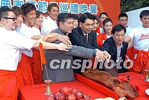 香港无线电视4月22日举行《雅典奥运节目巡礼》拜神及彩排,综艺及体育科制作高层,与应届港姐及众艺员齐在拜神仪式上切烧猪,祈求工作一切顺利。作者:邓庆乐