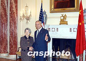 美国国务卿鲍威尔当地时间4月22日在美国国务院会见前来主持并参加中美商贸联委会的中国国务院副总理吴仪。中新社记者:余东晖