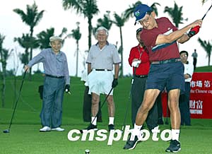 四月二十三日博螯论坛开幕在即,博鳌亚洲论坛理事长拉莫斯(右一)、澳大利亚前总理霍克(左二)、日本邮船株式会社名誉会长根本二郎(左一)共同为博鳌亚洲论坛高尔夫邀请赛开杆。中新社记者:郑萍萍