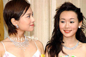 香港影视红星郭羡妮[左]、杨思琦,4月24日珠光宝气盛装出席“3D-GOLD”名表展览厅开幕典礼。作者:洪少葵