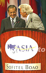 四月二十四日,马来西亚前总理马哈蒂尔(左)在博鳌论坛领导人峰会上发表演讲后,在主持人霍克的要求下接受现场提问。中新社记者:郑萍萍
