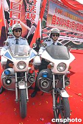 《中华人民共和国道路交通安全法》五月一日正式实施。四月二十五日,十余万北京民众走上街头宣传这一法规。威武的警员成为庞大宣传队伍中最为吸引人目光的焦点。中新社记者:任海霞