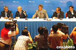 四月二十五日,龙永图在博鳌亚洲论坛2004年会闭幕新闻发布会上表示,博鳌亚洲论坛将成为一个世界级论坛。拉莫斯(右二)、根本二郎(左二)等理事会成员出席了发布会。中新社记者:郑萍萍