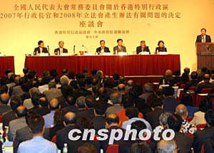 根据全国人大常委会今天上午就香港政制问题作出的决定,二OO七年行政长官和二OO八年立法会的选举,均不实行普选产生的办法;立法会的功能团体和分区直选产生的议员各占半数的比例维持不变,立法会对有关法案、议案的表决程式维持不变。在此大前提下,二OO七年行政长官和二OO八年立法会的具体产生办法,可按《基本法》有关规定作出符合循序渐进原则的适当安排。