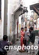 一对身着中式传统服装的青年男女在福州老城区“三坊七巷”里拍摄婚纱照。时下,越来越多的福州年轻人热衷怀旧风格的婚纱照。作者:郑祚声