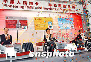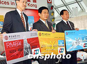 中国银行(香港)有限公司四月二十九日在香港正式宣布,于四月三十日率先推出中银人民币卡系列,包括中银人民币信用卡和中银卡(人民币),设有普通卡和金卡,卡面印有"银联"标志,可用于“银联”遍布全国多个省市约40万个商号网点。人民币信用卡亦可用于香港贴有“银联”标志及香港地区的中银香港、南洋商业银行及集友银行属下的自动柜员机24小时提取人民币或港币的便利服务。“中银人民币卡系列”启动仪式。作者:钱兴强
