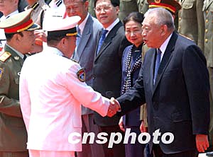 董建华出席欢迎解放军海军军舰编队仪式。由八艘主力军舰组成的中国人民解放军海军军舰编队,四月三十日停靠在香港昂船洲海军基地,进行为期五天的访问,在欢迎仪式上香港特首董建华与海军副司令员么兴远中将亲切握手。作者:钱兴强