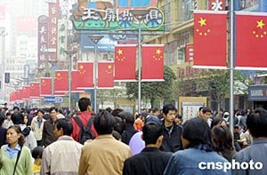 “五一黄金周”的第一天,上海街头人头攒动,鲜红的国旗洋溢着浓浓的节日气氛。作者:汤彦俊