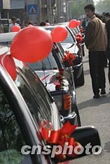 “五一”假期,北京市民办喜事的特别多,装扮一新的婚车在马路旁排成了行。中新社记者:史利